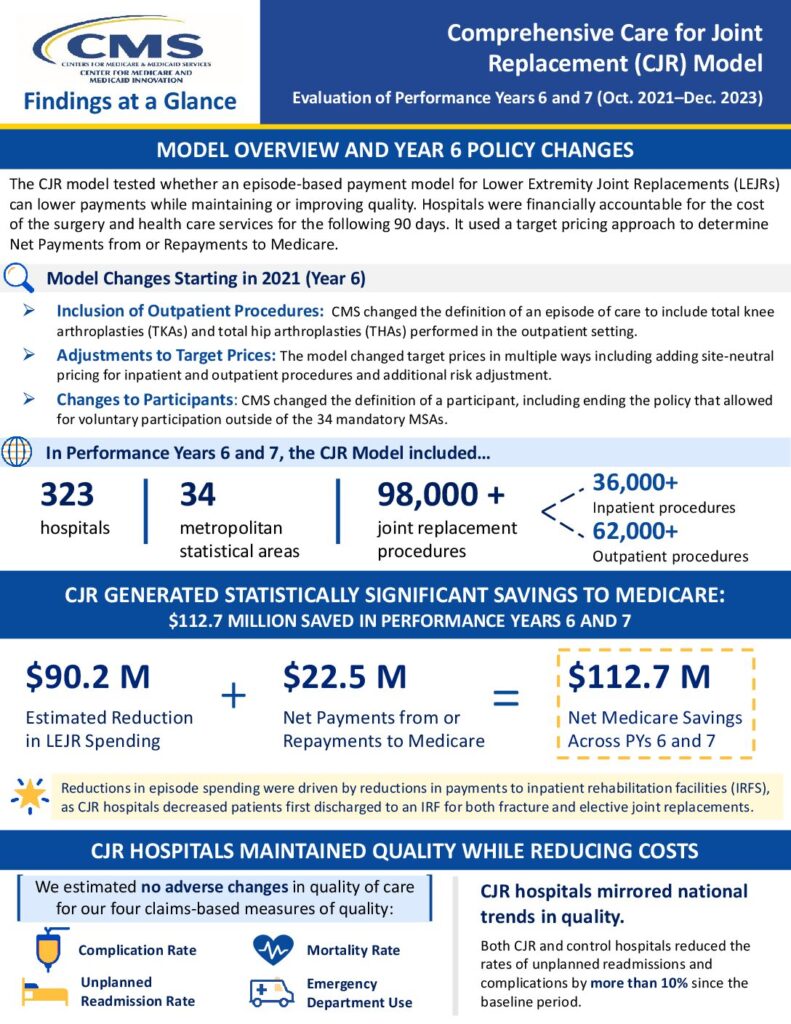 By Brian Murphy The Comprehensive Care for Joint Replacement (CJR) model is over, and it generated savings to Medicare. How much? We await the grand total, as final performance year financial results are expected later this year. But the latest, just released data (see attached graphic) shows that the CJR generated a whopping $112.7…